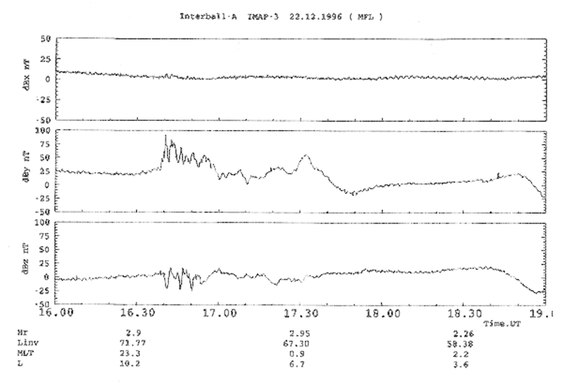 If we study the difference between model and measured magnetic field along Auroral Probe trajectory (see Fig.16) we can find that the magnetic field discrepancies are observed simultaneously with ion injections at ~ 16:40 UT on December,1996. It means that during ion injections there were currents which could disturb global magnetic field.