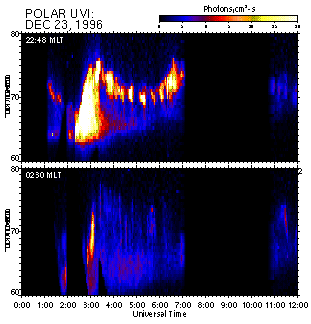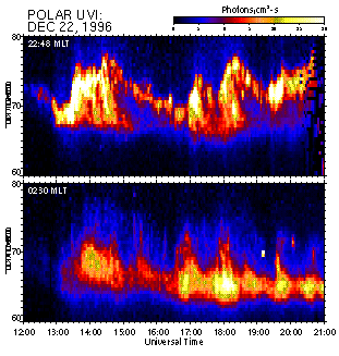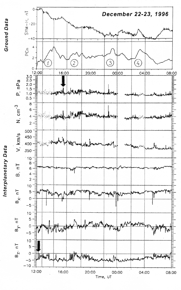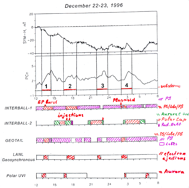 Ground-based and POLAR UVI data show that the magnetosphere was disturbed during observed period from 12:00 on December 22 to 08:00 UT on December 23, 1996. Fig.1 (a,b) presents the keograms from POLAR UVI (courtesy by K.Liou and POLAR UVI team) showing the auroral dynamics in coordinates "Latitude - UT" at two meridians, 22:48 MLT (top), and 02:30 MLT (bottom), i.e. at the meridians close to the footpoints of Interball/Tail Probe and Geotail, correspondingly. In addition to two large-scale substorm expansions starting at ~13 and ~16:30 UT there was a number of smaller scale activations. Detail analysis of ground station magnetograms confirms continuous magnetic activity throughout this interval, see Fig.2 where SYM-H and PCn indexes illustrate a behaviour of ring current and polar cap convection, respectively. These data allowed us to identify four substorms marked by figures from 1 to 4 and presented in Table 1.