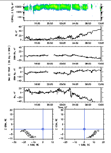 Bottom panels of Fig.5 show trajectory of Tail Probe (in GSM coordinate system) which was located at X ~ -20, Y ~ -10 and Z ~ -2 RE in the plasma sheet region. Measurements of magnetic field magnitude and 3 components and ion energy spectrogram (measurements of CORALL channel oriented perpendicular to X-axis - satellite spin axis) confirm that during the most part of interval the Tail Probe was in the plasma sheet (near neutral sheet) and only after 03 UT on December 23, 1996 the satellite began to move to south lobe. Substorm periods were characterized by short (several minutes) intervals of PS plasma disappearance (1st, 3rd and 4th substorms) or by change in parameters of PS plasma (2nd substorm).