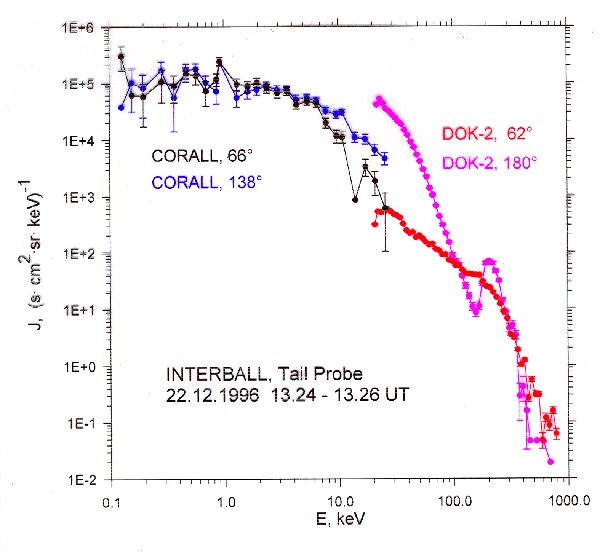 Several unusual phenomena were observed during and between substorms. Fig.6 presents ion energy spectra measured by CORALL and DOK-2 instruments during short ion burst at 13:25:00-13:25:30 in 1st substorm interval. Before and after this burst the satellite was outside PS (in north lobes). Tailward ion spectra measured by CORALL under angle 66 degrees relative to X-axis (black curve) and DOK-2 under angle 62 degrees (red curve) demonstrate a common smooth spectrum with temperature ~ 10 KeV. The CORALL channel, which is the nearest to the Earthward direction and is oriented under 138 degrees relative to the Sun (blue curve), showed that ion flux in this direction was higher in energy range > 10 KeV than tailward flux. More high ion flux was observed by DOK-2 channel measured Earthward flux (ping curve). Thus, the flux difference between Earthward and tailward ions with E ~ 10-30 KeV was ~ 2 order of magnitude and Earthward ions had a large and narrow peak with E ~ 200 KeV.