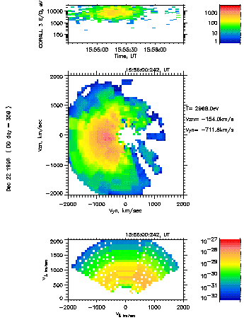 Distribution function calculated on the basis of CORALL measurements for time interval of 15:54:30-15:56:30 are presented in Fig.8. Top panel shows ion energy spectrogram, medium panel - projection of distribution on the plane perpendicular to spin axis, bottom panel - cylindrical projection relative to spin axis. We can see that plasma has large components of velocity as Earthward as perpendicular to this direction. Our calculations show that plasma moved in GSM frame with Vx ~ 700, Vy ~ 600 and Vz ~ 100 km/s (Fig.9 presents the direction of plasma motion relative to the average position of magnetopause).
