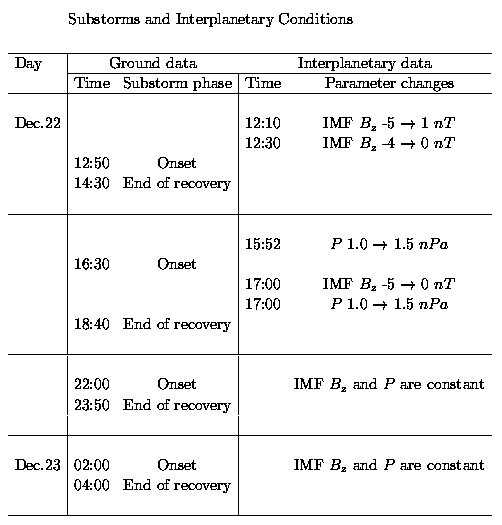 Interplanetary conditions (dynamic pressure P, density N, velocity V, magnitude B and three components of IMF) are presented on bottom panels of Fig.2. This time interval is characterized by low, nearly constant pressure and continuous southward IMF. First substorm is likely to be initiated by IMF Bz changing from -5 to +1 nT at 12:10 UT, and second substorm could be due the pressure jump recorded at 15:50 UT. There was no changes in the interplanetary space which might initiate third and fourth substorms. Table 1 consists of substorm time intervals and times of interplanetary condition changes.