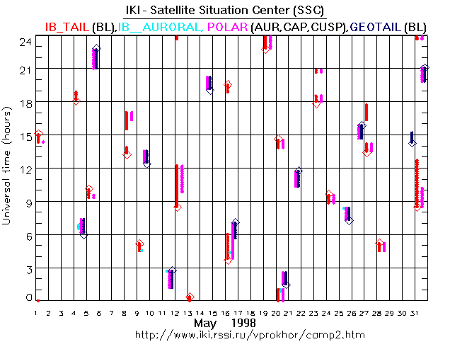 On the plot the real time (UT) of the FSP events is shown. Date is shown along the X-axis, the UT - along the Y-axis.