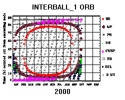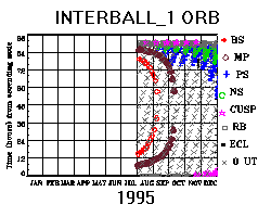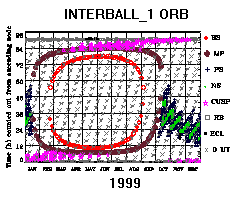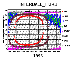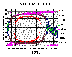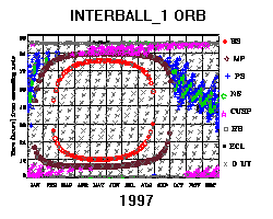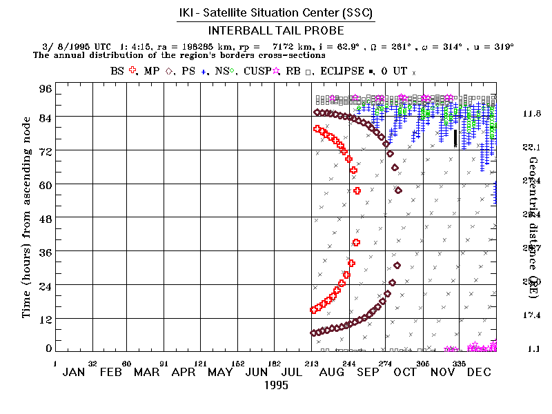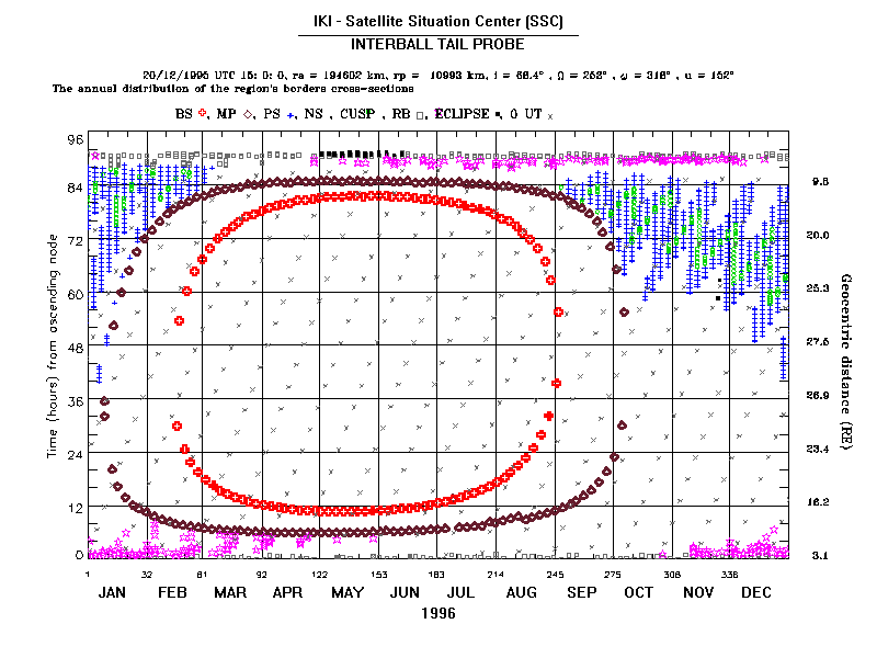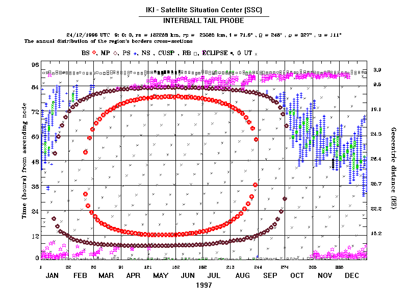 The annual time and space distribution of the covered by the orbit magnetospheric regions are shown for each year separately.