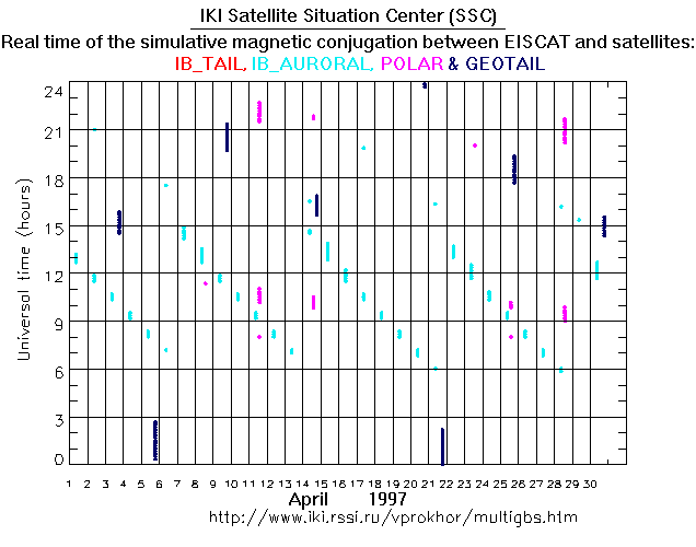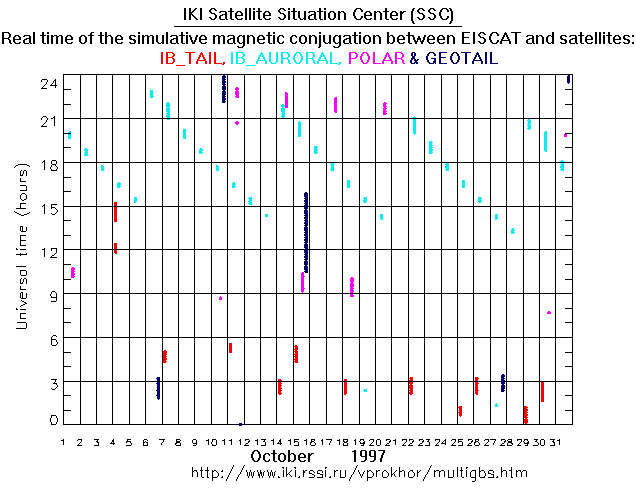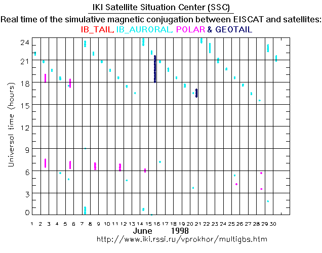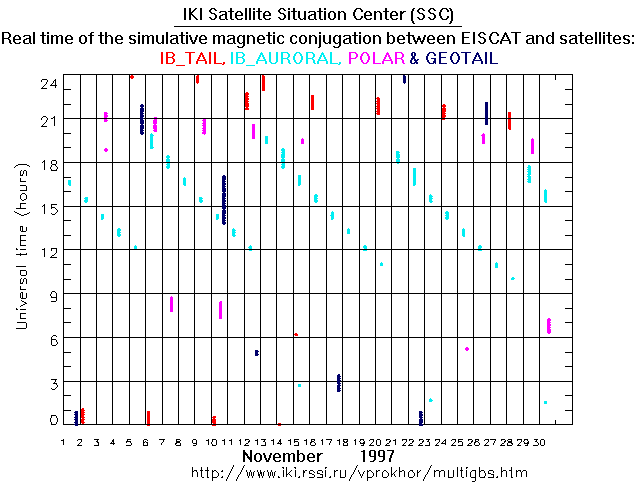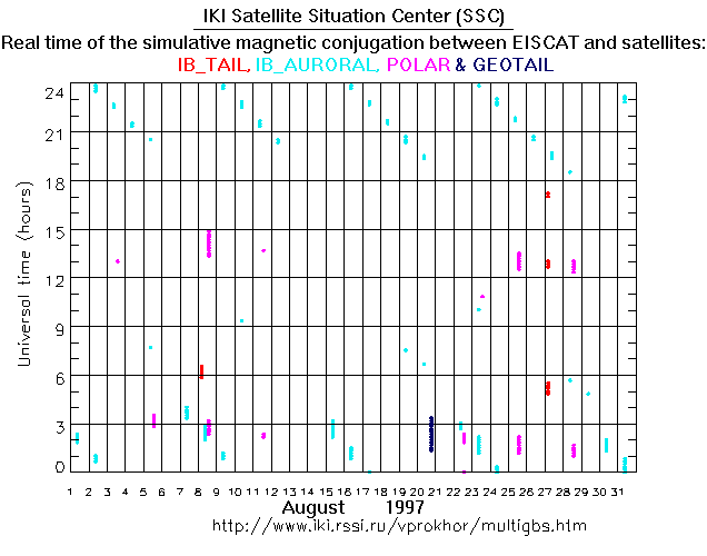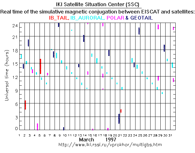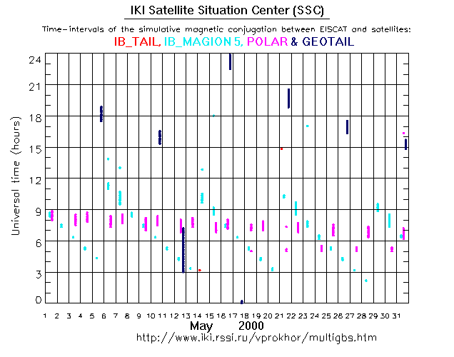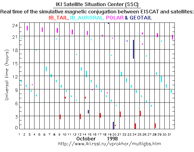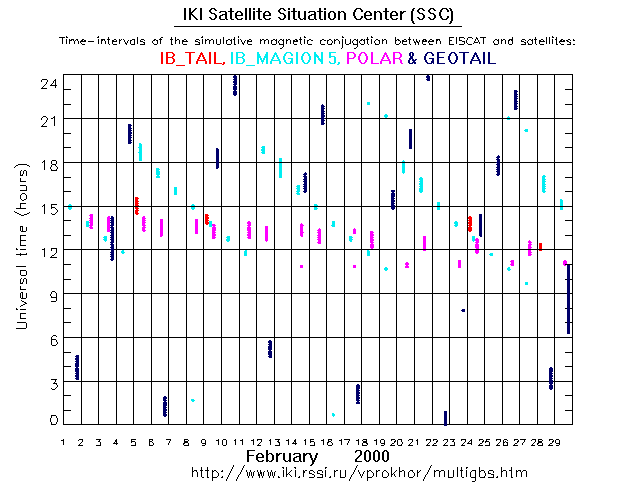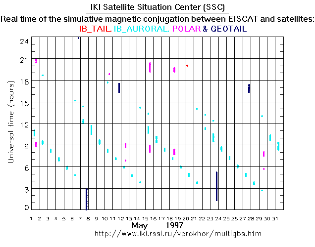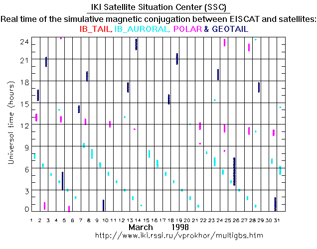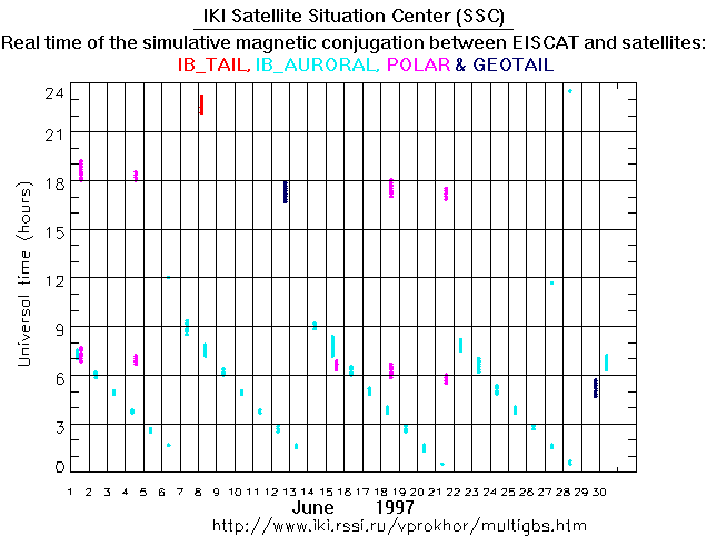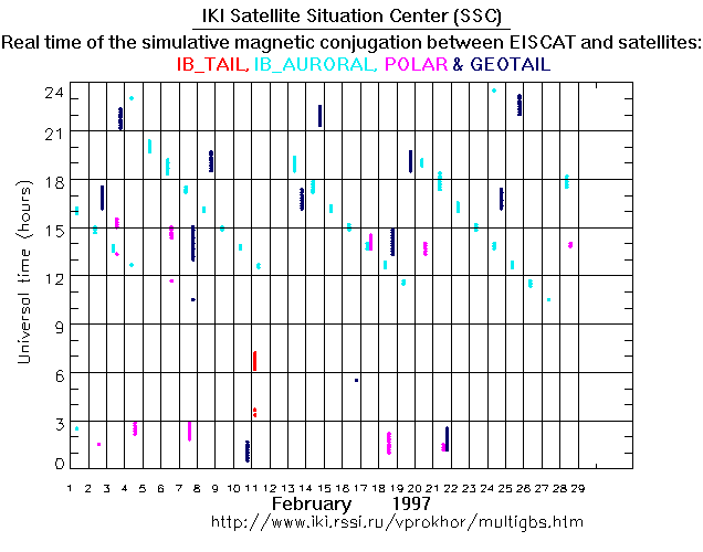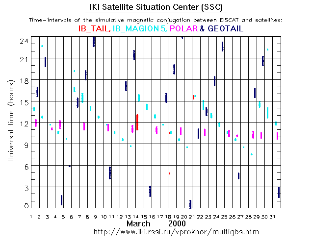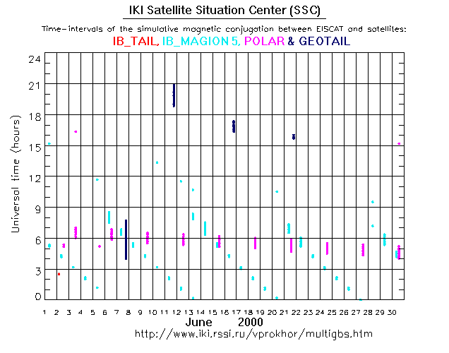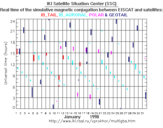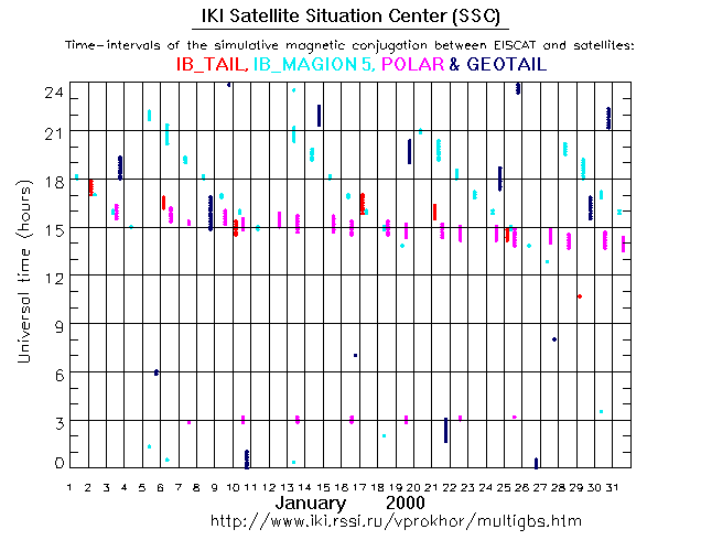 For each month separately the time intervals of the simulative magnetic conjugations between EISCAT an various spacecraft are shown on the plot and on the ASCII files.
