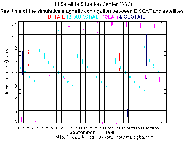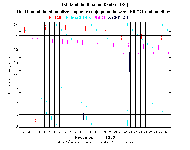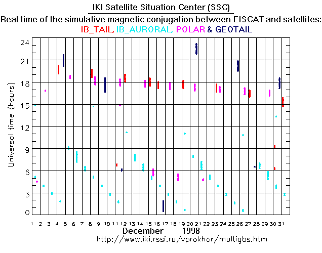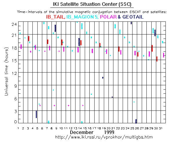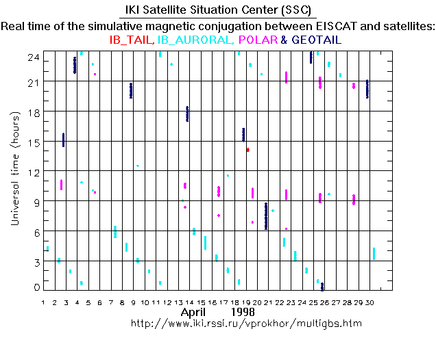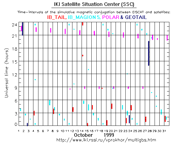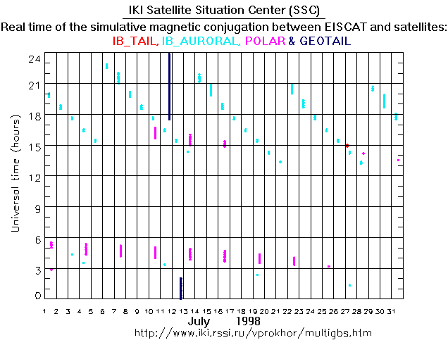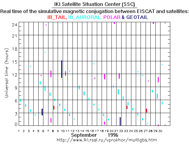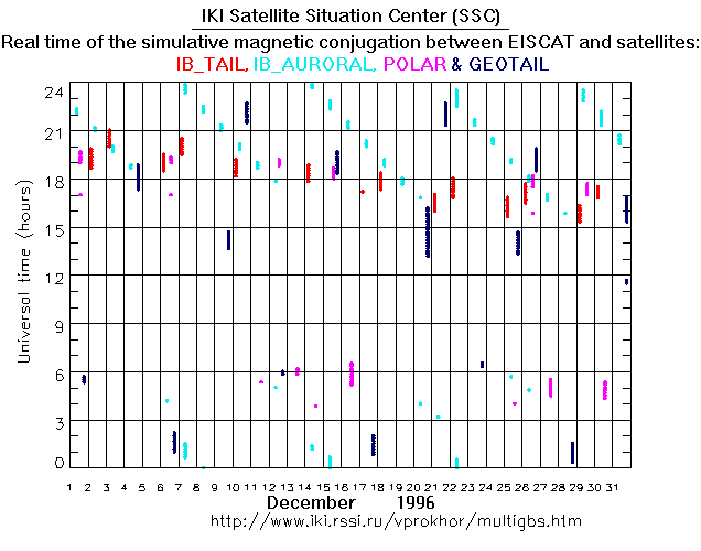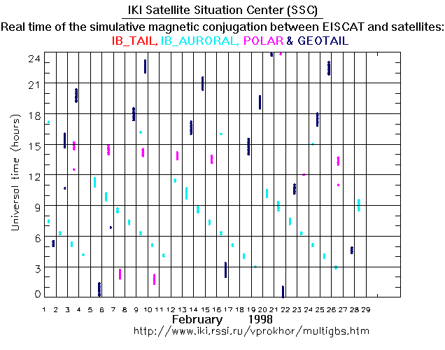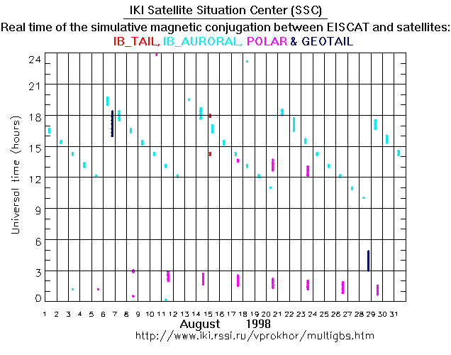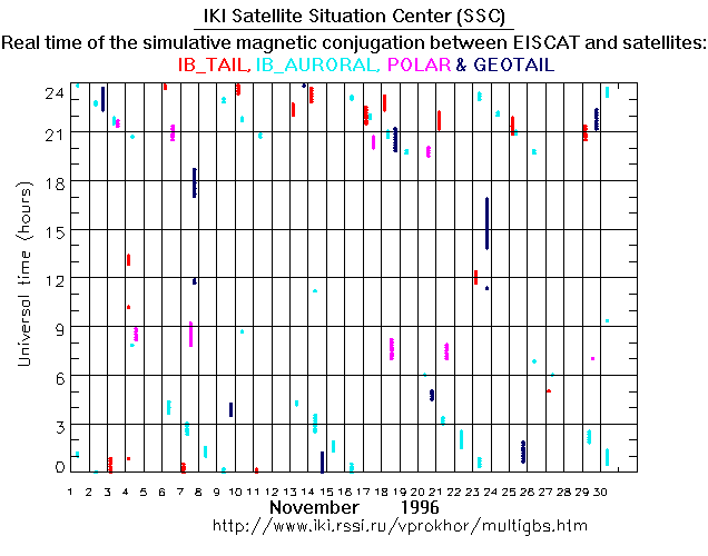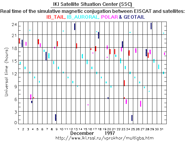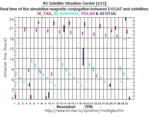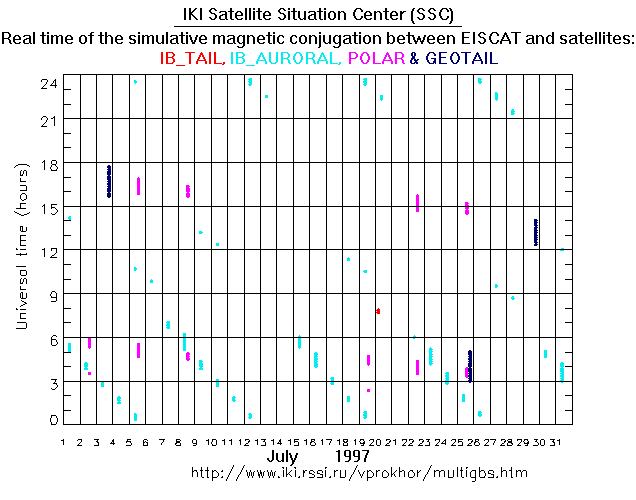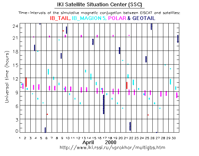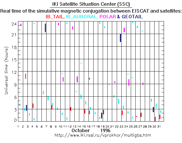 For each month separately the time intervals of the simulative magnetic conjugations between EISCAT an various spacecraft are shown on the plot and on the ASCII files.