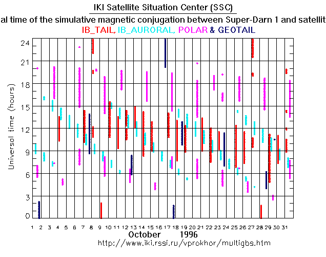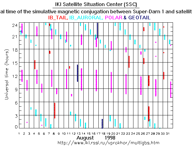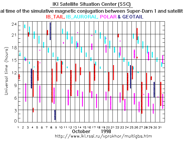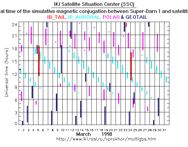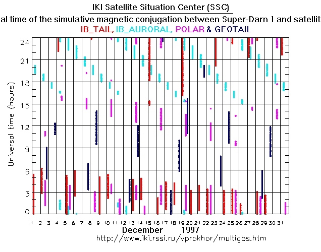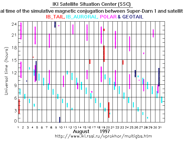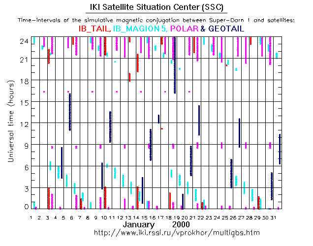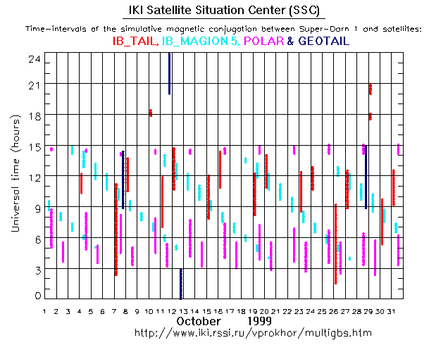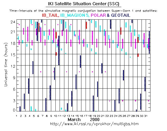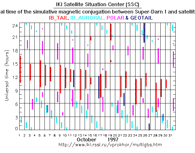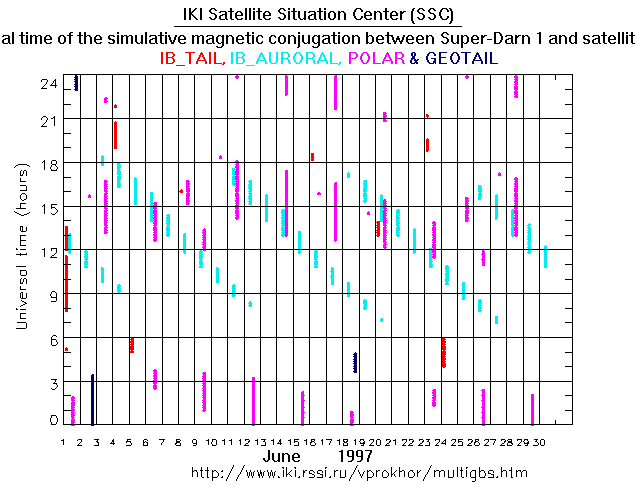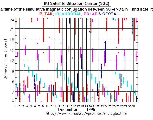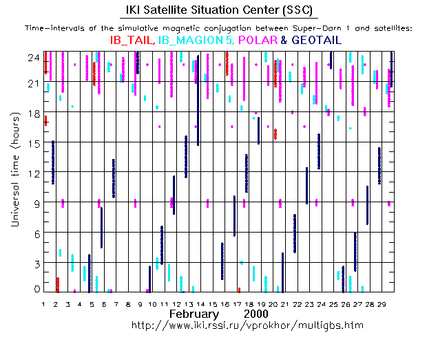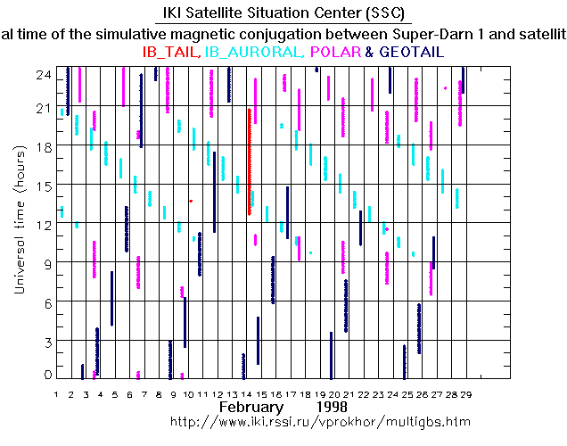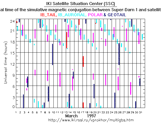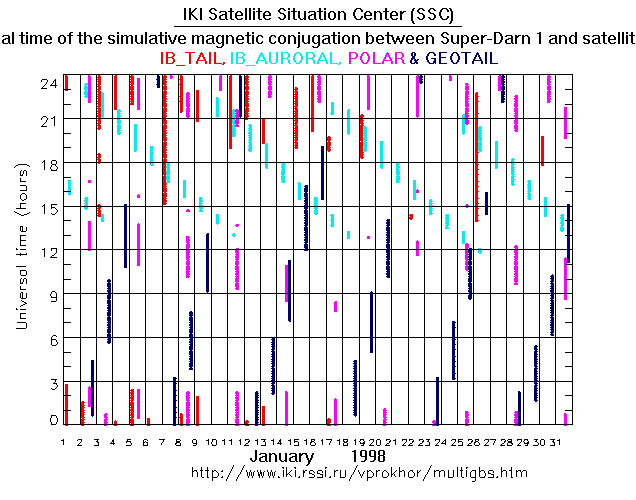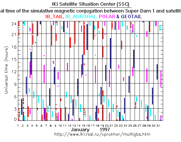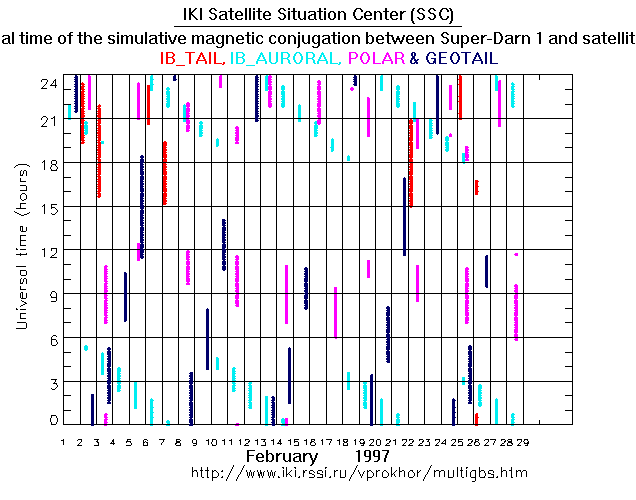 For each month separately the time intervals of the simulative magnetic conjugations between Super Darn 1 an various spacecraft are shown on the plot and on the ASCII files.