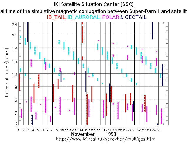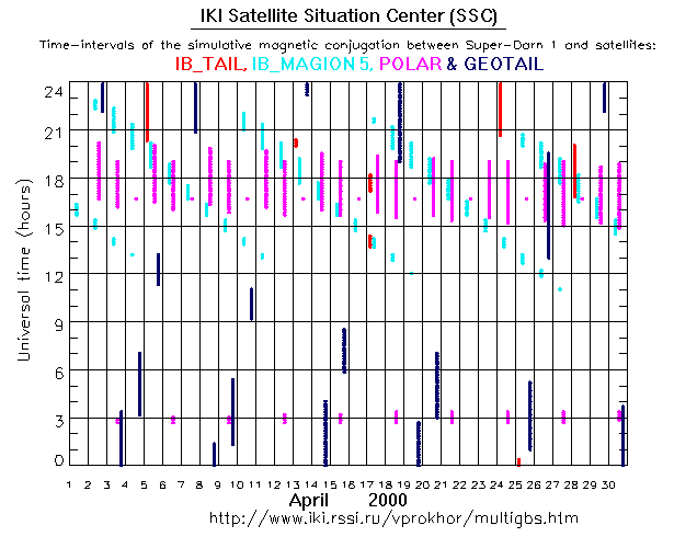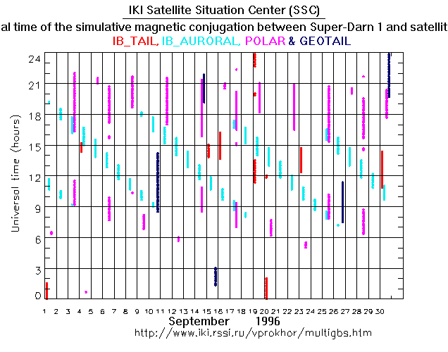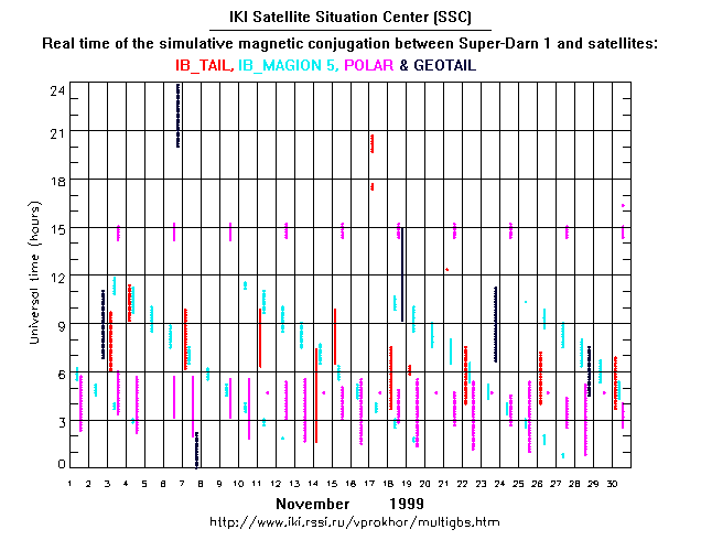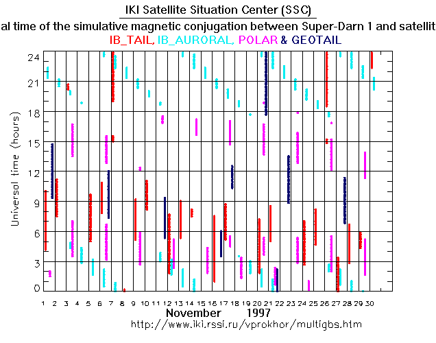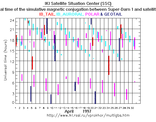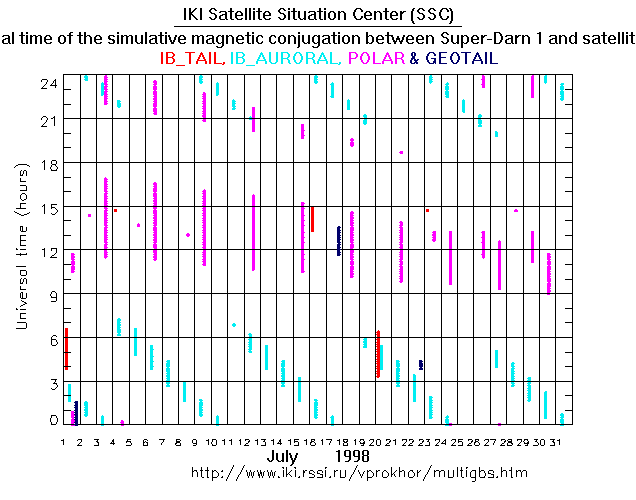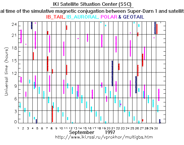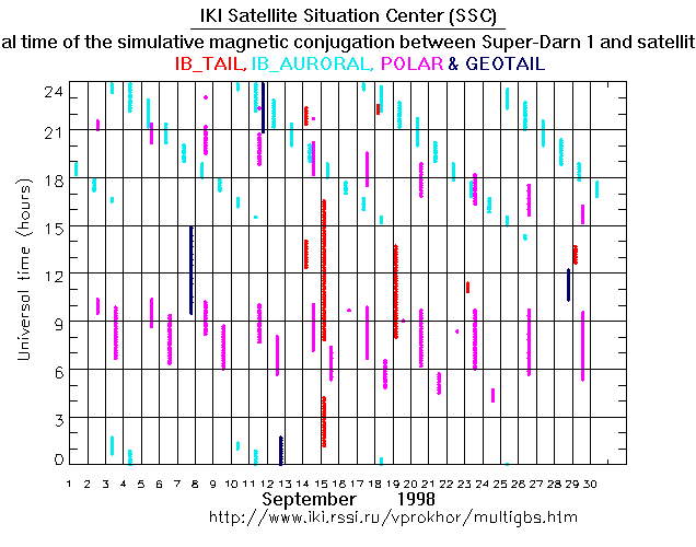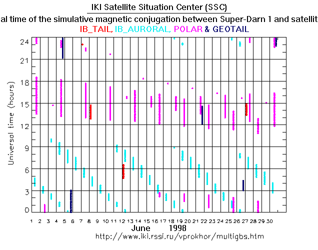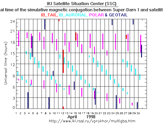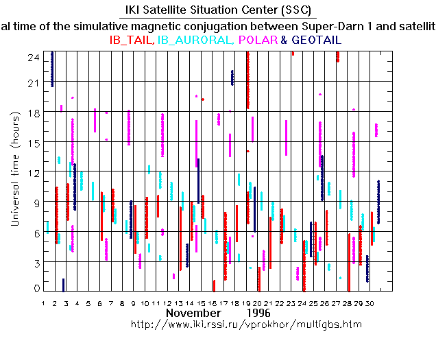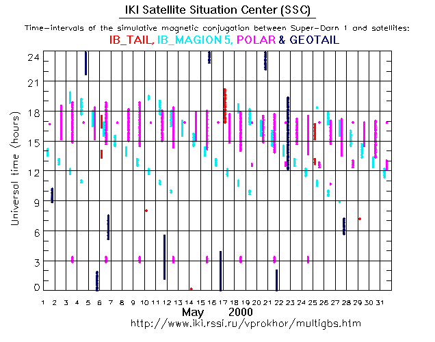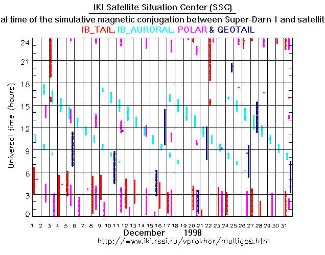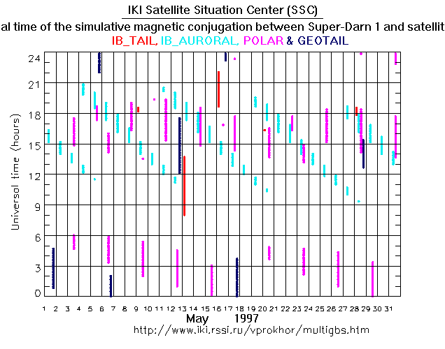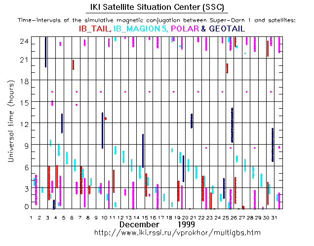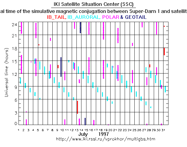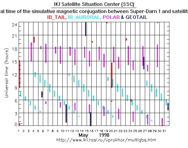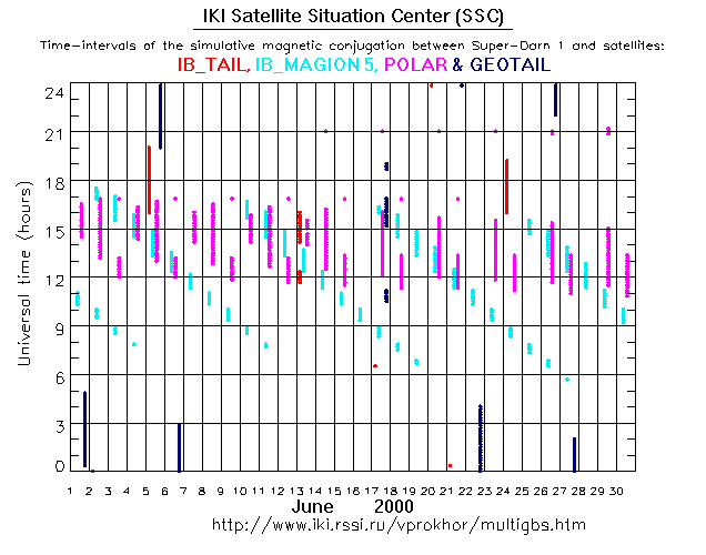 For each month separately the time intervals of the simulative magnetic conjugations between Super Darn 1 an various spacecraft are shown on the plot and on the ASCII files.