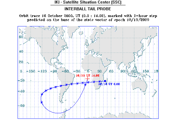 The trace is marked by the symbols as follows: the blue circle cporrespons to 0.0 UT of the last day; the blue star marks the SC position with 1-hour step; the red cross marks the last point of the trace.